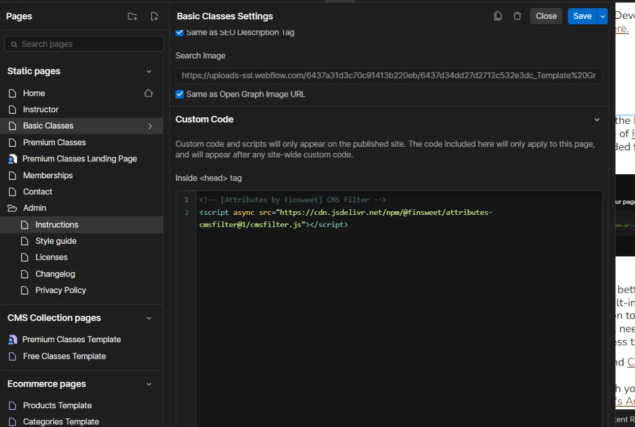 - To add the filter functionalities to the Basic classes pages and Premium classes pages, make use of Finsweets filter functionality. Add the script provided to the <head> section of the page